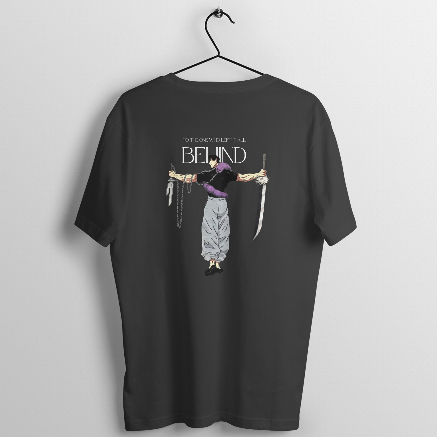 A bold and gritty Toji-inspired design featuring a dark, high-contrast illustration of him, shadowed in neon hues or grunge textures. The phrase “To the one who left it all behind” is scrawled in a distressed, almost hand-painted font, giving it a rebellious and raw edge. The background could incorporate shattered glass effects, eerie smoke, or abstract urban decay, emphasizing his mercenary, no-strings-attached nature. Perfect for a punk-streetwear aesthetic with a touch of anime menace.
